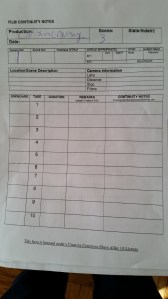 The Film Continuity Notes provides important references and directions for the editor to use later in post-production. One important piece of information to note is that a particular shot is not usable (for example, due to a dialog change in a later take of the same scene) thus saving the editor valuable time.
