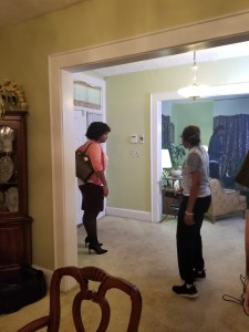 Here is a video showing blocking/rehearsal of the scene. There is plastic on the couch and adjacent chair, leading to some funny sounds. There are also some behind-the-scenes photos. All media from the author.