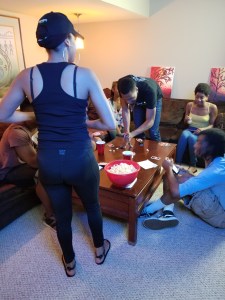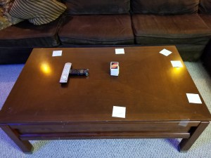 Markers, with character names, were placed on the coffee table adjacent to the couch for the game scene. This was done to ensure proper seating. The seating positions were finalized after several iterations. Considerations included camera angles, such as the framing of a wide shot, and the relationships between the characters.