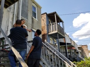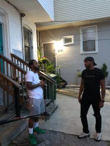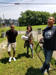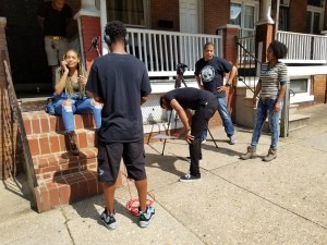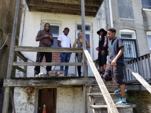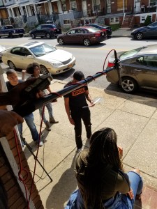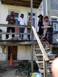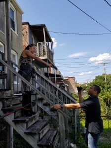 “Shock Nation” is shot in and around Baltimore, MD. All shooting is “done on location” on streets, in parks, inside residences and businesses, and in alleys. Baltimore has alleys located between streets, behind residences and/or businesses. Lots of interesting terrain, fences, driveways, doorways, utilities, narrow passageways, steps, parking areas, patches of grass, and isolated free-standing structures that could be garages or storage sheds. This is an ideal place to shoot because of this variety. It is less confining than shooting on streets and provides more varied infrastructure. The reader will see some of that in the photos below. The alleys look like a movie studio backlot, but bounded by real structures.
