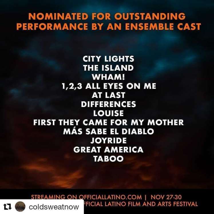 “Wham!” written by Wi-Moto Nyoka and directed by Sandra Manzanares and Wi-Moto Nyoka, is one of the films at the Official Latino Film and Arts Festival. “Wham!” is the first episode of “Cold Sweat,” created by Dusky Projects. (Alan Greenstein of Support Our #creatives has helped to fund some of Wi-Moto’s projects and is a executive producer on “Wham!”) Her film is one of ten projects in Block 3, available starting on November 27. In addition, “Wham!” is nominated for the following awards: