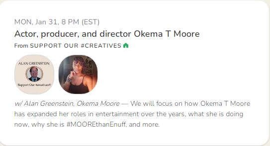 Originally broadcast live on January 31, 2022. The weekly Support Our #creatives Clubhouse room. Special guest actor, producer, and director Okema T Moore. We will focus on how Okema has expanded her roles in entertainment over the years, what she is doing now, why she is #MOOREthanEnuff, and more.