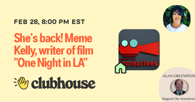 Originally broadcast live on February 28, 2022. The weekly Support Our #creatives Clubhouse room. We welcome back special guest Meme Kelly, creator of the organization Elevated Stories and writer of the upcoming film “One Night in LA.” Meme will provide an update on the film, as well as discuss the process.
