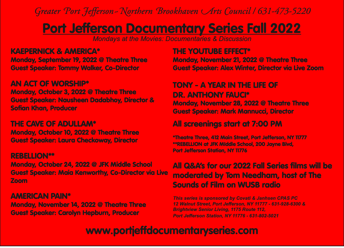 The Port Jefferson Documentary Series is thrilled to announce its “2022 Fall Series.” Mark your calendars for September 19, October 3, October 10, October 24, November 14, November 21, and November 28.