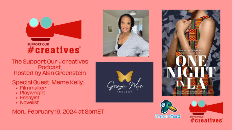 The Support Our #creatives® podcast, hosted by Alan Greenstein. Special guest is Meme Kelly: Filmmaker, Playwright, Essayist, and Novelist. We will discuss her film “One Night in LA,” her mother’s impact which led to the establishment of the Georgia Mae Project, her upcoming Storytelling Workshop, early projects, and planned projects.