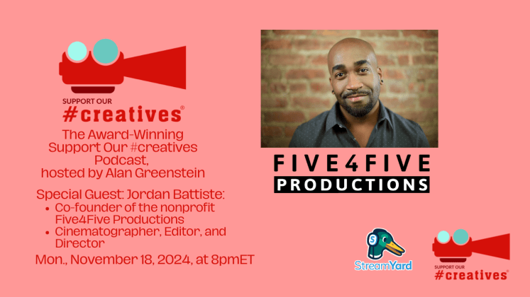 Originally live streamed via StreamYard on November 18, 2024. The Award-Winning Support Our #creatives® podcast, hosted by Alan Greenstein. Special guest is Jordan Battiste: Co-Founder of Five4Five Productions, and a cinematographer, editor, and director. We will talk about Five4Five Productions, a nonprofit media arts program focused on creating original short films with students in underserved communities. We will also discuss his contributions to Temese Chavis’ project “Confessions,” and more.