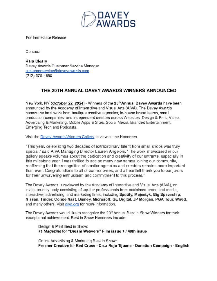 - 2024 Viddy Awards: Honorable Mention: Non-Broadcast; Video Podcasts; TV & Film (podcast in general, no particular episode: Support Our #creatives® podcast)