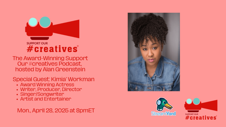 Original live stream date April 28, 2025, via StreamYard. The Award-Winning Support Our #creatives® podcast, hosted by Alan Greenstein. Our special guest is Kimia’ Workman: Award winning actress, writer, producer, director, singer/songwriter, artist, and entertainer. Let’s learn how Kimia’ does so well in all these disciplines, from films to web series to music videos, and more!