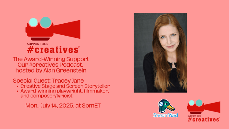 Original live stream date July 14, 2025, via StreamYard. The Award-Winning Support Our #creatives® podcast, hosted by Alan Greenstein. Our special guest is Tracey Jane, an award-winning playwright, filmmaker, and composer/lyricist. We will discuss her films, including “Life is Torture,” her live theatre projects, her composing experience, and her continuing education to improve her craft, and more!