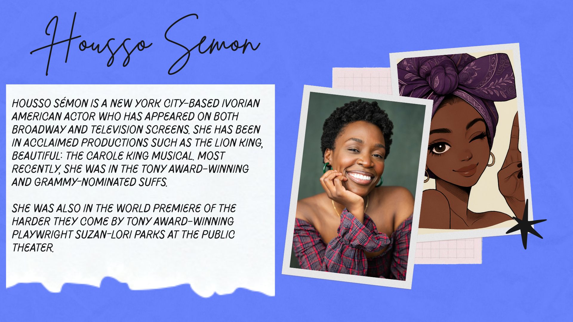 Housso Sémon is an actor, singer-songwriter, and Broadway co-producer of Wanted: The Musical, which is headed to Broadway in 2026. Originally from the Ivory Coast, she is an immigrant and first-generation artist. Her Broadway credits include The Lion King, Girl From the North Country, Beautiful: The Carole King Musical, and Suffs. Her debut solo concert, Out of The Blue, premieres September 15, 2025, at Five Flies Coffee in Washington Heights.