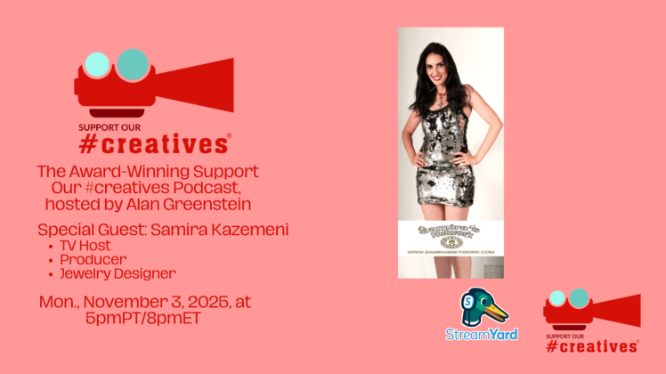 Original live stream date November 3, 2025, via StreamYard. The Award-Winning Support Our #creatives® podcast, hosted by Alan Greenstein. Our special guest is award-winning television host, internationally acclaimed producer, and jewelry designer Samira Kazemeni. Samira is known worldwide as the driving force behind the annual Luxury Gala (Academy Awards® viewing event) and for her consulting firm, Samira’s Network. Tune in to learn all about this and more!